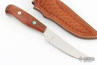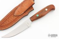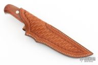 This knife by Terry Barrett features a mirror polished blade with .163" blade stock and 1.000431" blade depth, full tapered tang construction. The handle has wood scales with nickel silver pins. Comes with a hand tooled brown leather sheath and a zippered case. Has a few light scratches, otherwise excellent condition.