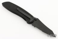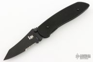 The H&K Scorch Code 3 features a unique dual-action design. The black blade is D2 tool steel with a reverse tanto design with notched thumbrest and dual thumbstuds. The handle is textured black G-10 with black stainless steel liners and tip down clip. Comes with H&K drawstring bag and incorrect box. Has a couple light scuffs, otherwise excellent condition.