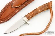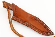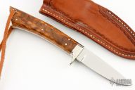 This knife by Terry Barrett features a mirror polished blade with .128" blade stock and .813" blade depth, full tang construction. The handle has a nickel silver guard and wood scales with nickel silver pins. Comes with a hand tooled brown leather sheath. Has a few light scratches, otherwise excellent condition.