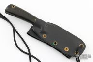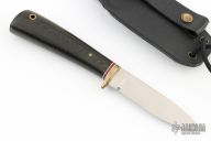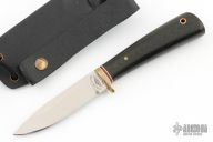 This Mini Colorado Scout by Colorado Cutlery features a satin finished blade with .095" blade stock and .652" blade depth, hidden tang construction. The handle has a brass guard, black linen micarta grip with white and red spacers, lanyard hole. Comes with a kydex leather sheath. Has a couple light scratches, otherwise excellent condition.