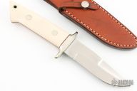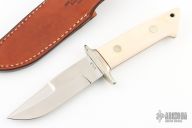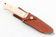 This Chute Knife by Jimmy Lile features a satin finish blade with a sharpened top edge, .183" blade stock and 1.184" blade depth, full tapered tang construction. The handle has a nickel silver guard and pins with mammoth ivory scales and red liners. Includes a brown leather sheath and a zippered case. Excellent condition.