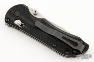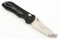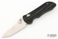 This is a Benchmade mini stryker features a stonewash tanto blade with dual thumb studs and a notched thumbrest. The handle features black G10 scales over steel liners and a black tip up pocket clip. Includes the original box and papers. Excellent condition.