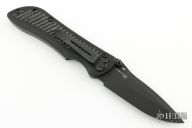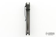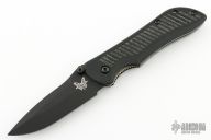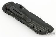 This Mini Stryker by Benchmade features a black spear point blade with a plain edge, dual thumbstuds and notched thumbrest. The handle has black G-10 scales, titanium liners, and a tip down black stainless steel clip. This is a discontinued model. Comes with original box and papers. Has a couple light scuffs, excellent condition.