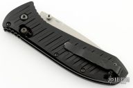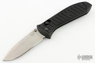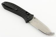 This 570 Presidio II by Benchmade features a bead blasted drop point blade with swedge and dual thumb studs. The handle is comprised of black anodized and machined aluminum over black steel liners and barrel spacers. Axis lock mechanism. Black coated tip up clip is reversible for left or right hand carry. Comes with original box. Excellent condition.