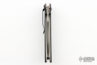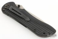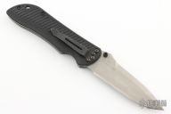 This 913D2 Nitrous Stryker from Benchmade features a bead blasted drop point blade with swedge, dual thumb studs and notched thumb rest. The handle is comprised of textured black G10 scales over titanium liners and black barrel spacers. Black coated stainless steel tip down pocket clip. Light scuffs are visible on the pocket clip. Excellent condition. Includes original box and drawstring pouch.
