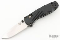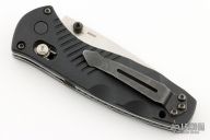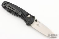 This Mini Barrage by Benchmade Knives features a drop  point tumble finished blade with dual thumbstuds. Assisted opening. The handle has black FRN scales with stainless steel liners, and a fileworked aluminum backspacer. Black tip up stainless steel clip. Comes with original box and papers. Excellent condition.