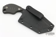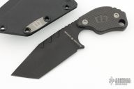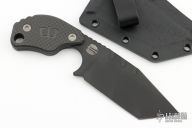 This SLCC by Mick Strider features a black tanto blade with a notched thumbrest, .154" blade stock and 1.477" blade depth. The handle has a finger groove and ring. Comes with a kydex sheath. Excellent condition.