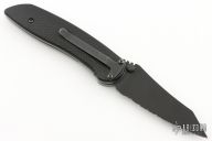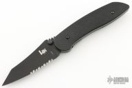 The H&K Scorch features a unique dual-action design. The handle has a black drop point blade with notched thumbrest and dual thumbstuds. The handle is textured black FRN with black stainless steel liners and tip down clip. Excellent condition. Comes with original box.