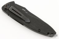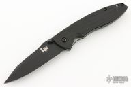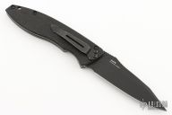 This assisted opening Knife features a black spear point blade with a notched thumbrest and dual thumbstuds. The handle features black G10 scales over titanium liners and a black tip down pocket clip. Includes the original box and papers. Excellent Condition.