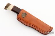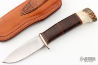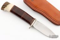 This Knife by Morseth Knives features a satin finished laminated steel blade with .176" blade stock and 1.020" blade depth, hidden tang construction. The handle has a nickel silver guard, stacked leather grip with black/white/red spacer pattern and a stag butt. Comes with a brown leather sheath, Has a couple very light scratches, otherwise excellent condition.