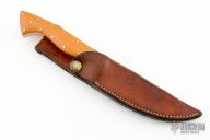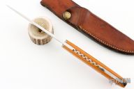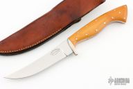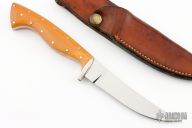 This knife by AM Maddux features a mirror polished blade with .179" blade stock and .961" blade depth, full tang construction. The handle has a nickel silver guard with yellow paper micarta scales, fileworked tang. Comes with brown leather sheath. Excellent condition.