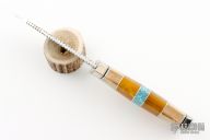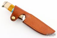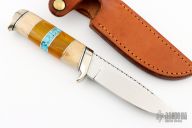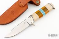 This Hunter by RD Nolen features a mirror polished blade with a fileworked spine, .189" blade thickness and 1.186" blade depth, hidden tang construction. The handle has a nickel silver guard and butt, oosic/amber/turquoise grip with white/black/aluminum spacers. Comes with a brown leather sheath. Excellent condition.