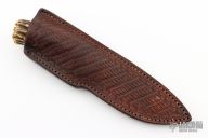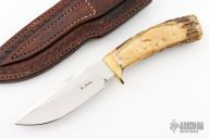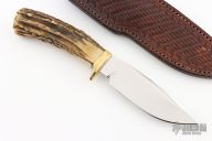 This hunter by Don Norton features mirror polished drop point blade with false top edge, .177" blade stock and 1.384" blade depth, hidden tang construction. The handle is composed of brass guard and butt, carved stag grip. Carving of a bear in the woods. Comes with a hand tooled brown leather sheath. Excellent condition.