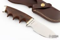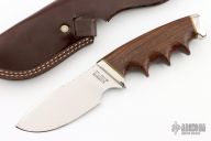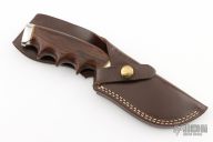 This Model 400 by Gerber Legendary Blades features a polished blade with notched thumbrest, .145" blade stock and 1.481" blade depth, hidden tang construction. The handle has a stainless steel guard and butt with wood grip and brass spacers, has finger grooves. Comes with a brown leather sheath. as a few very light scratches, otherwise excellent condition.