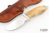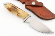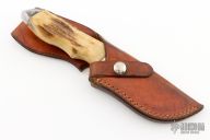 This Model 425 by Gerber Legendary Blades features a mirror polished drop point blade with notched thumbrest, .141" blade stock and 1.471" blade depth, hidden tang construction. The handle has a stainless steel guard and butt with stag grip and brass spacers, has finger grooves. Comes with a brown leather sheath. as a few very light scratches, otherwise good condition.