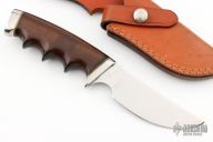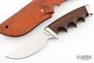 This Model 425 by Gerber Legendary Blades features a mirror polished blade with notched thumbrest, .141" blade stock and 1.471" blade depth, hidden tang construction. The handle has a stainless steel guard and butt with wood grip and brass spacers, has finger grooves. Comes with a brown leather sheath. as a few very light scratches, otherwise good condition.