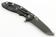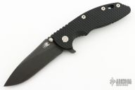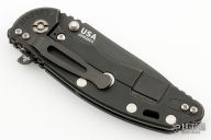 This 3.5" XM-18 flipper from Hinderer Knives has a battle black blade with notched thumbrest and flipper, no choil. Black G-10 scale and a battle black finished titanium frame and pocket clip. Reversible pocket clip. Strong lock up, nice detent and blade seating is center. Includes original box, extra bushings and papers. New condition.