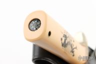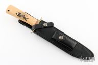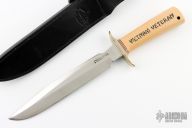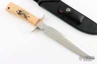 This Model 1-8 by Randall Made Knives features a satin finished blade with sharpened top edge, .234" blade stock and 1.215" blade depth, hidden tang construction. The handle has a nickel silver guard, ivory paper micarta grip with red/white/blue spacers, scrimshaw on the handle done in 2008 and is signed "Faustino"? Comes with black leather sheath and a zippered case. Excellent condition. I think that this is a reproduction if you will of an actual 1-8 Vietnam Veteran. Should have had a brown sheath and the scrimshaw on an original was done by Skaggs. Also not supposed to have a compass in the butt.
