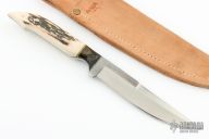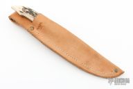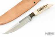 This knife by Anza Knives features a blade made from a Nicholson file with a false top edge, this one was sharpened by Rod Chappel, .192" blade thickness and 1" blade depth, full tang construction. The handle has wood bolsters, stag scales and brass liners. Comes with a brown leather sheath and a zippered case. Excellent condition.