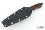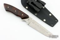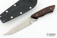 This neck knife by Master Smith Murray Carter features a San Mai Damascus blade with a false top edge, .129" blade thickness and 1" blade depth, full tapered tang construction. The handle has desert ironwood scales. Comes with kydex sheath and a zippered case. Excellent Condition.