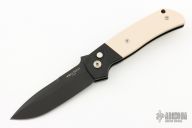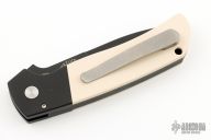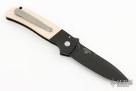 This ATCF Auto by Pro-Tech features a DLC Magnacut blade with notched thumbrest. The handle has a black aluminum frame with ivory paper micarta scales, tip up milled titanium clip with hidden screws. Comes with original box and papers. Excellent condition.