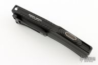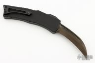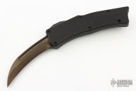 This Custom ROC by Heretic Knives features a hand ground DLC coated blade with fullers and notched thumbrest. The handle has a black aluminum chasis with atip down DLC titanium clip with ceramic ball. Fat Carbon Black Dunes inlay in the push button. Comes with original box and COA #080. Excellent Codnition.