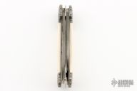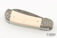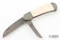 This knife by Phil Booth features two Damascus blades both with single nail nicks.  The larger blade is an automatic and is released/unlocked by pushing down on the smaller blade.  The smaller blade is a slipjoint.  The handle has front/rear Damascus bolsters and walrus covers.  Stainless steel backspring.  Excellent Condition.