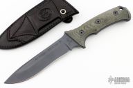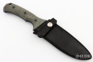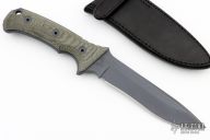 This Neil Roberts - BUD/S Class 184 - Warrior Knife has a matte black S30V stainless steel drop point blade with full tang and notched thumbrest.  .225" Blade Stock.  1.334"Blade Depth. Handle is canvas micarta with lanyard. Knife is in excellent condition. Comes with a custom black leather sheath by Kenny Rowe. Has a couple light scuffs, otherwise excellent condition.