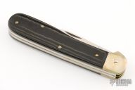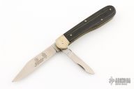 This knife by Hubertus is unique, it features two satin finished blades. The larger blade is an auto and is fired by pressing down on the back of the small blade. The handle has nickel silver bolsters, micarta scales, brass liners and steel springs. Has some patina and light scratches, otherwise excellent condition.