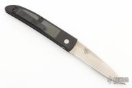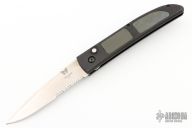 The 3000s automatic from Benchmade is a discontinued model designed by Mel Pardue. Side opening, coil spring. Satin finish partially serrated blade, black aluminum frame with rubber inlays and a tip up stainless steel clip. Excellent condition. Comes with Benchmade box and papers.