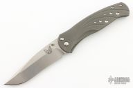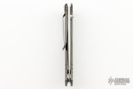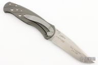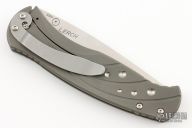 The Subrosa is a collaboration project between Ken Steigerwalt and Matt Lerch. They have patent pending status on this mechanism. They sold the manufacturing rights to Benchmade, who produces factory versions utilizing this mechanism. The key elements that make this assisted mechanism a cut above are the two titanium leaf springs connected together with a hardened roller that engages on the blade. Because the roller follows the blade during the opening and closing motion, there is little to no wear to the components. Tumble finished S30V stainless steel drop point blade with single thumb stud. Milled titanium frame with titanium barrel-type spacers, and bead blasted stainless steel tip down clip. Late lock-up, slight lock stick. Has a couple light scuffs, otherwise excellent condition. Comes with original box and papers. First Production #076/1000