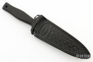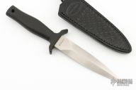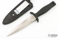 This Mark I dagger by Gerber is double-edged and satin finished, .241" blade stock and .950" blade depth, hidden tang construction. Black coated aluminum handle. Comes with black leather sheath with boot clip (not original, but perfect fit). #I3792S. The tip has been reprofiled, otherwise excellent condition.