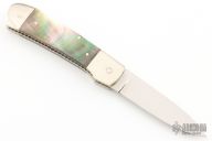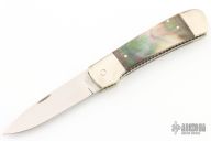 This Scale Release Auto by features a mirror polish drop point blade. The handle has double nickel silver bolsters, black lip pearl scales, fileworked nickel silver liners and a fileworked stainless steel backspacer. Nice action, lockup and blade seating.  Has some light scratches on the handle otherwise the knife is in excellent condition.