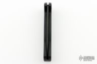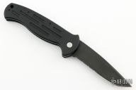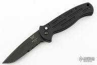 This Early AFO Automatic from Benchmade features a black drop point blade with swedge and partial serrations. The handle is comprised of black aluminum with a lanyard hole in pommel. Includes a nylon sheath and BM box. Has some light scuffs and scratches, great condition otherwise.