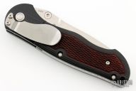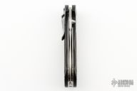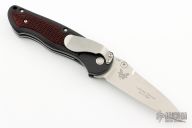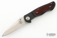This 672SBX Apparition by Benchmade features a tumbled drop point blade with swedge, dual thumb studs and notched thumb rest. The handle has G-10 scales over steel liners and file worked steel backspacer. Checkered wood inlays. The black steel pocket clip is positioned for right hand, tip down carry. Comes with BM box and papers. Excellent Condition.