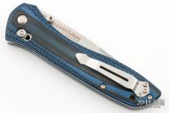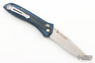 This Benchmade 710-1401 features a stonewash finished drop point blade with "710-1401 Limited" on the blade. The handle is blue/black milled G10 with the axis locking mechanism and reversible deep carry clip positioned for tip up carry. Nice action, detent and blade seating. Comes with original box and papers. Excellent condition.
