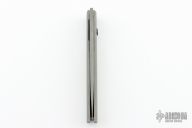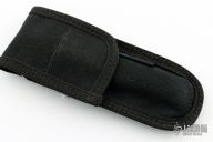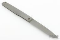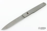 This Linerlock Automatic by Jeff Harkins features a bead blasted drop point blade. The handle is comprised of a bead blasted stainless steel frame over barrel spacers and an inlaid lockbar, has a blued steel spring. Has some scuffs and light oxidation spots, has a small ding in the blade edge, otherwise good condition. Comes with a nylon belt sheath.