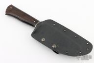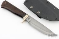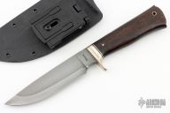 This Hunter by Master Smith Ed Caffrey features a hand rub satin finished blade with nice hamon, .201" blade stock and 1.292" blade depth, hidden tang construction. The handle has a fluted nickel silver guard, carved rosewood grip and black and nickel silver spacers. Comes with a kydex sheath with a TekLok. Has a couple very light scratches, otherwise excellent condition.