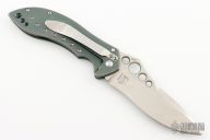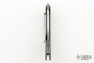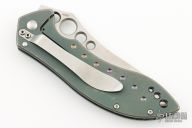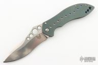 This 630 Skirmish is a Neil Blackwood design executed by Benchmade. It features a recurve tumble finished drop point recurve blade with thumb hole and notched thumb rest. The handle is comprised of a bead blasted and anodized frame with drilled and anodized accents over titanium barrel spacers. The tumbled steel pocket clip is positioned for right hand, tip down carry. Includes BM box and papers. Has scuffs, scratches, and has been resharpened. Good user condition.