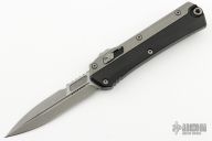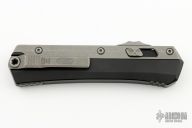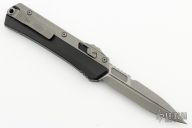 This Glykon by Microtech features a apocalyptic finished double edged blade with fullers and notched thumbrest. The handle has a black aluminum chassis with apocalyptic finished titanium overlays and tip down clip. Comes with original box and papers. Dated 05/2023 and #1507.  Excellent condition.