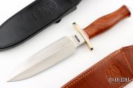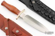 This Tom Clinton Special by Randall Made Knives has a double-edged stainless steel satin finished blade, .243" blade stock and 1.658" blade depth, hidden tang construction. The handle has a forward curved nickel silver guard, ironwood burl grip, duralumin butt. Comes with a brown leather sheath and a custom Croc skin sheath by Sullivan's Leather. Excellent condition.