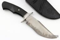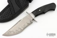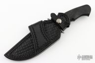 This Bodyguard by Journeyman Smith Ben Seward features a San-Mai blade (W1 Core 410 Clad) with sharpened top edge, .285" blade stock and 1.852" blade depth, hidden tang construction. The handle has a stainless steel guard, black linen micarta grip with single nickel silver pin. Comes with a hand tooled black leather sheath. Excellent condition.