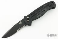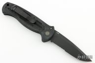 This 9052 AFO auto has a black blade with partially serrated edge. Black anodized aluminum handle. Integrated safety system. Black stainless steel clip - up or down reversible, and lanyard hole. Has some light scuffs and scratches, otherwise great condition.