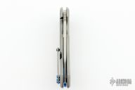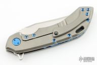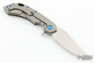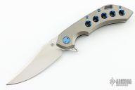 This Wayfarer 247 from Olamic Cutlery features a satin finished clip point blade with swedge, thumb hole, notched thumb rest and flipper. The titanium handle scales are orange peel finished titanium with matching pocket clip is positioned for tip up carry, matching floating polished anodized titanium backspacer. The Wayfarer 247 is very comfortable in the hand and flips well with no wrist action needed. Blade is centered when closed and locks up with no play. Comes with zippered case and maker's card.  8/31/2022.  Excellent condition.