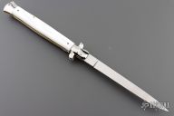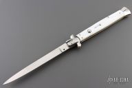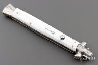 This 13" Picklock by Frank Beltrame features a flat ground blade. The handle has stainless steel bolsters, front and rear, pearlex scales, brass liners, stainless spring. Excellent condition.
