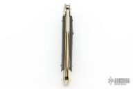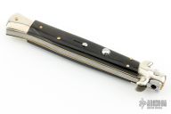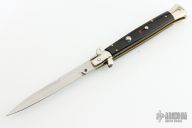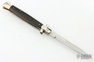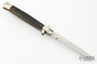 This 11" Swivel Bolster Auto by Frank Beltrame features bayonet dagger ground blade with false top edge. The handle has nickel silver bolsters, front and rear, buffalo horn scales, brass liners, stainless spring. Excellent condition.