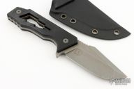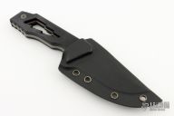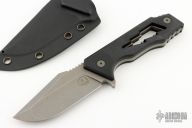 This J Cape by Something Obscene Company features a dark tumbled blade with notched thumbrest, .205" blade stock and 1.448" blade depth, full tang construction with black G-10 scales. Comes with a kydex sheath with belt clip.  Excellent condition.