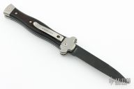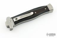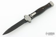 This Zero model features a black G-10 handle and a black finished bayo blade. The AGA Campolin Zero automatic offers Italian-made craftsmanship at it's very finest. This model is characterized by a flawless fit and finish, rock solid blade lock up, and snappy automatic deployment. The Zero is definitely not your grandpa's Italian stiletto, with black G-10 handle scales, stainless steel bolsters, and a high performance N690Co steel blade. A stainless steel tip-down pocket clip finishes off the solid EDC design. Features: Black G-10 handle scales offer a sleek look and a high-performance grip. Stainless steel pocket clip for comfortable everyday carry. Austrian Bohler N690Co blade steel provides a strong, durable blade edge. Comes with original box. Excellent condition.