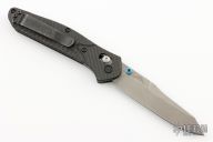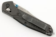 The Warren Osborne designed Benchmade 940 is a popular knife for good reason. It's a comfortable everyday carry knife with its slim design, great ergonomics and lightweight. The 940-1 has a premium CPM-S90V steel blade with a plain edge and a stonewash finish. The carbon fiber handle has stainless steel liners and blue anodized aluminum barrel spacers. The AXIS lock and reversible pocket clip make the knife usable for right and left-handers. Has some light scuffs, has been resharpened, otherwise good condition. Comes with original box.