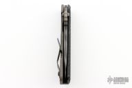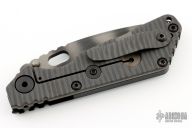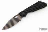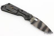This SNG framelock folder by Mick Strider features a tiger striped blade and a dimple pattern black G-10 and flamed titanium frame and tip up titanium clip. Includes a "Lock Bar Stabilizer" for maximum reverse lock retention. Nice detent, lockup and blade seating. Excellent condition.